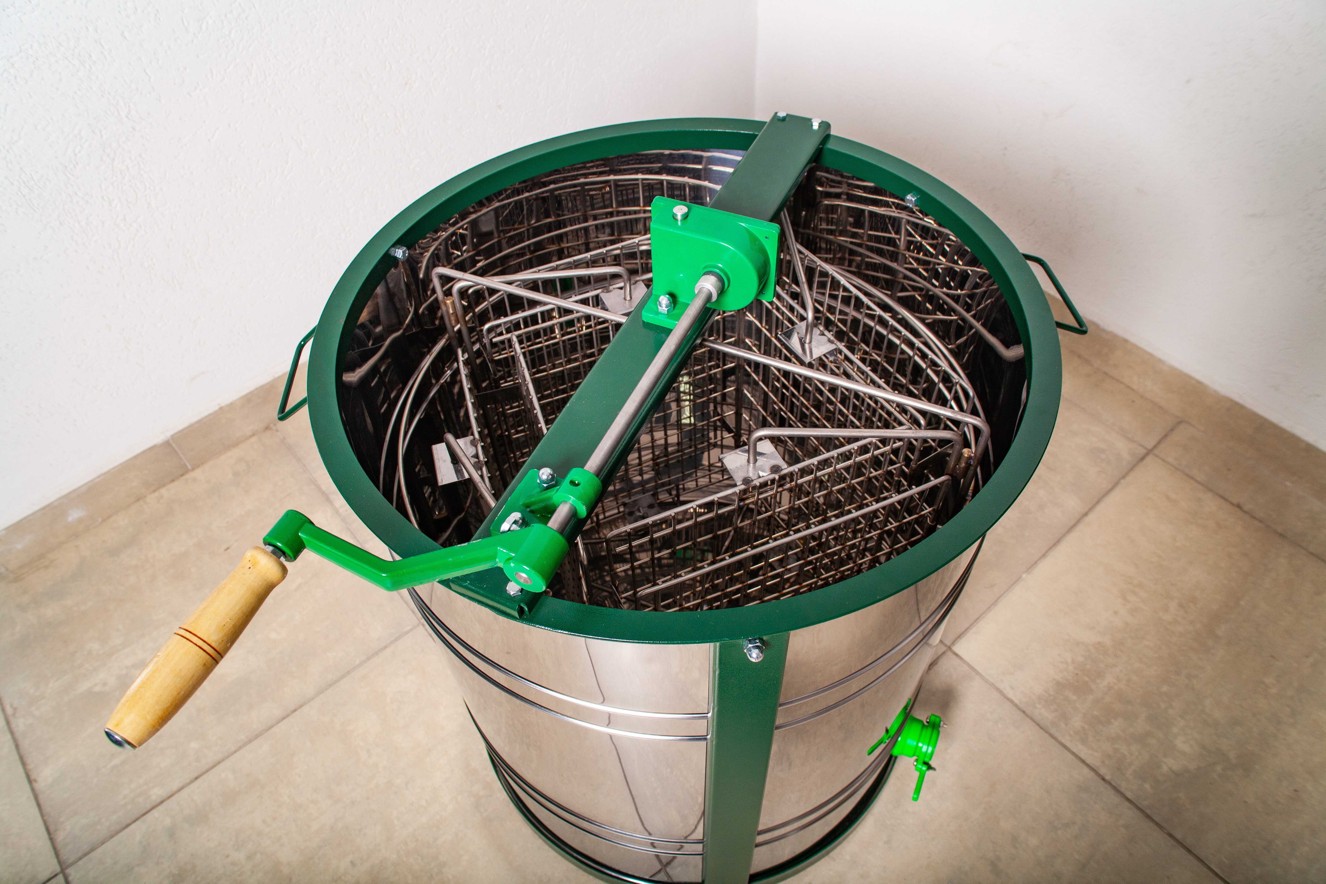 Ножки медогонки закреплены к нижнему и верхнему металлическому ободу медогонки, что делает ее более устойчивой и надежной при работе и транспортировке.