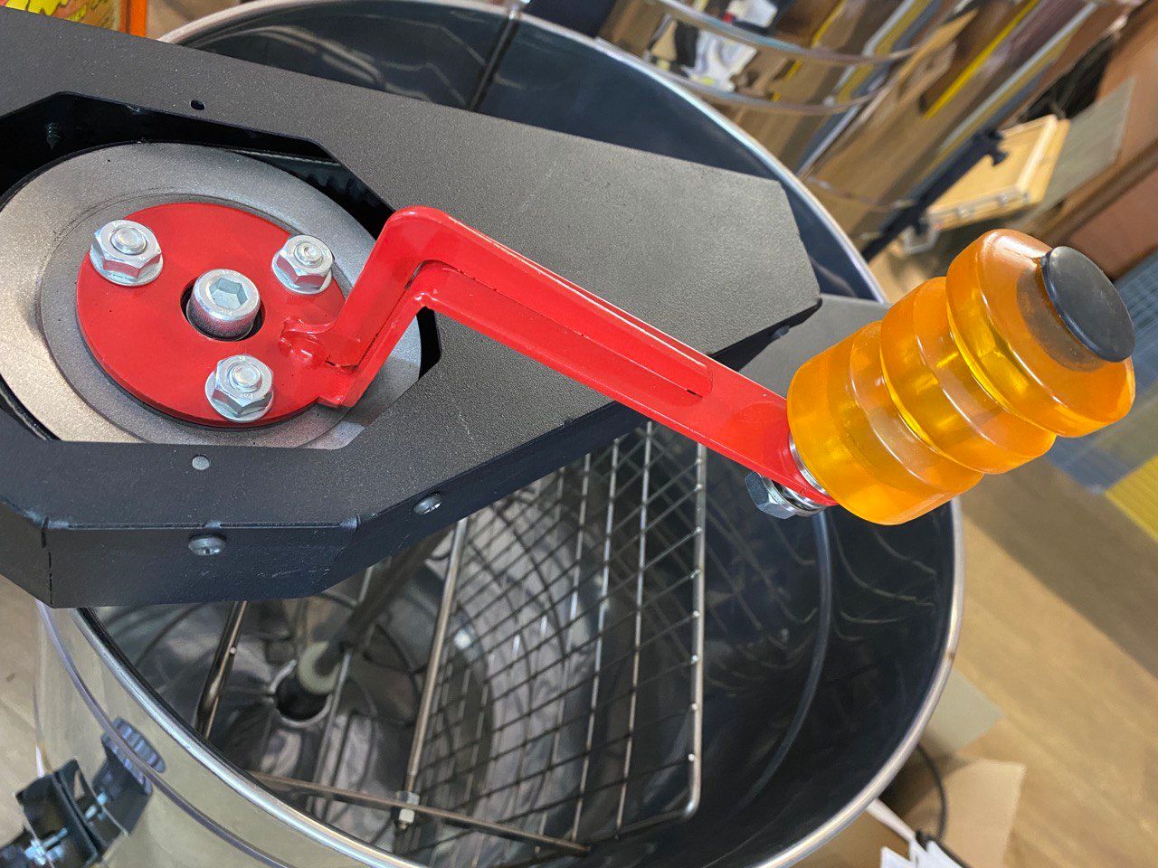 Привод позволяет вращать корзину в медогонках как по часовой , так и против часовой стрелке !
